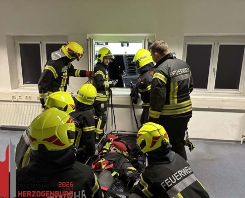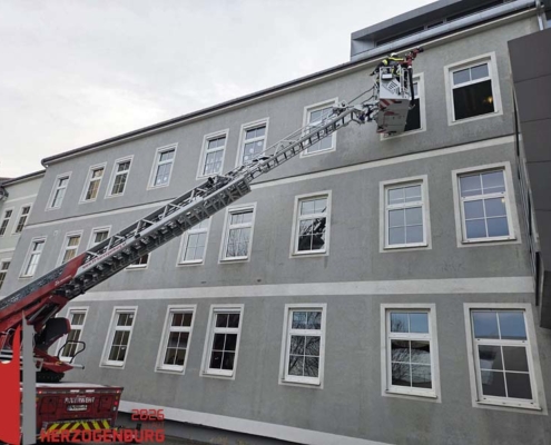 Übung Am 5. März 2026 wurde im Übungsdorf die Menschenrettung mittels Drehleiter aus einem Büro geübt.
