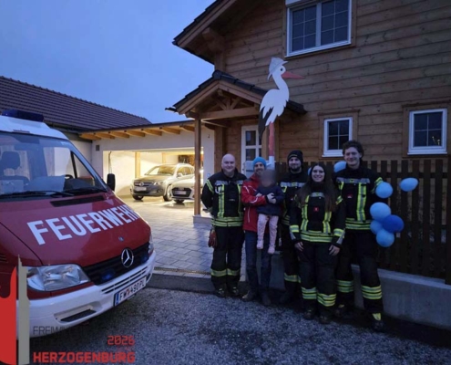 Allgemein Am 26. März 2026 gratulierte eine Abordnung unserem Gehilfen des Fahrmeisters zur Geburt des zweiten Kindes und stellte den Feuerwehrstorch auf.