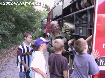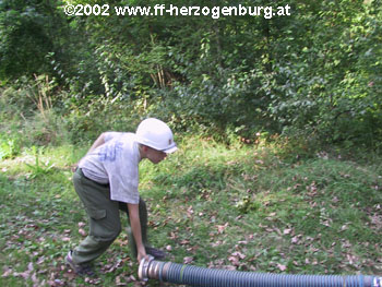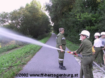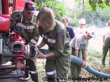 Übungssaison hat wieder begonnen. Pünktlich um 17Uhr versammelten sich die altgedienten Jugendmitglieder genauso wie 5 neue und warteten schon gespannt auf die Übung. Da es schön und relativ warm war, fuhren wir nach Oberndorf zur "12er Buhne". Dort saugten wir mit der Tragkraftspritze Wasser aus der Brunnader und spritzen mit 2 C Strahlrohren in die Traisen. |