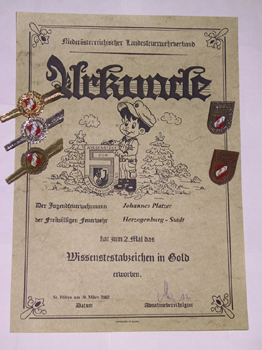 ![]() Die Abzeichen + die Urkunde für das 2. Mal Antreten beim Wissenstest in Gold |