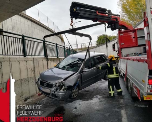 Durch die Feuerwehr wurde das Unfallfahrzeug von der Straße entfernt und gesichert abgestellt.