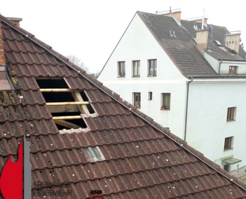 Bei einem Gemeindebau wurden mit Hilfe der Drehleiter davongewehte Dachziegeln wieder montiert.