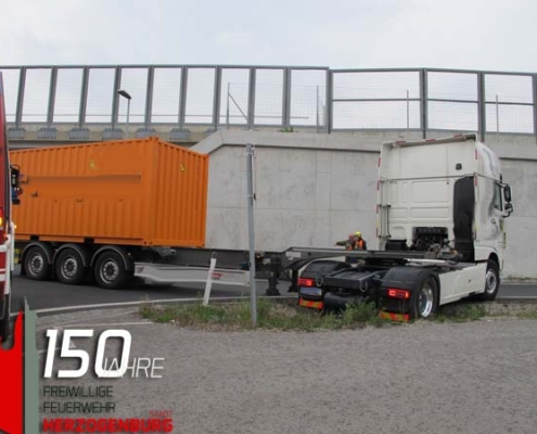 Mittels Rüstlöschfahrzeug und Abschleppstange wurde der LKW-Zug angeschleppt und bis zu einem sicheren…