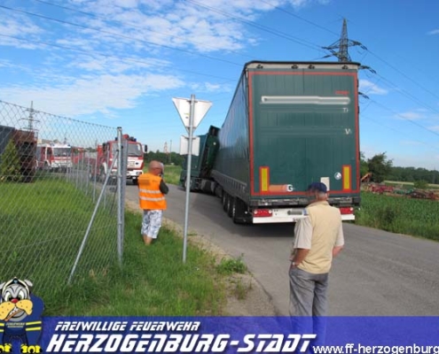 Einsatz, Technisch Ein festgefahrener Sattelzug zog einen Feuerwehreinsatz nach sich. Im Bereich der Zufahrt zu einem Betriebsgelände geriet der LKW über die befestige Fahrbahn hinaus und blieb stecken.