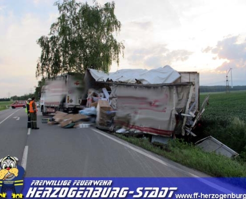 Einsatz, Technisch Am Abend des 1. Juni kam es auf der Landesstraße B1 im Bereich Maria Jeutendorf am Bösen Berg zu einem Verkehrsunfall mit einem beteiligten Kraftwagenzug.