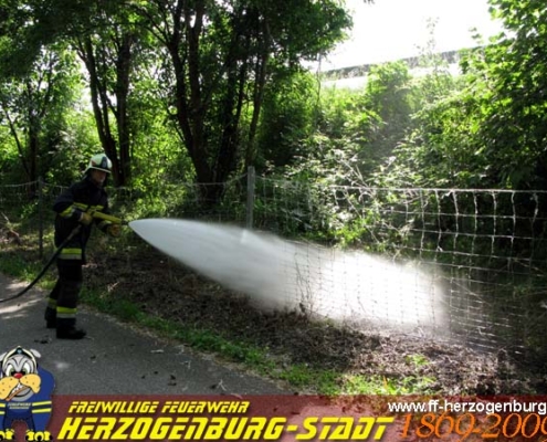 Zwischen Hochwasserauffangbecken und Traisenau standen rund 600m Böschung in Brand, der teilweise bereits wieder erloschen war.
