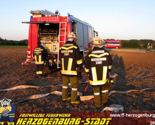 Übung Bei der wöchentlichen Übung am 7. August wurde ein Brand einer Scheune, in der fiktiv Kunststoffabfälle gelagert werden, samt anschließendem Flurbrand beübt.