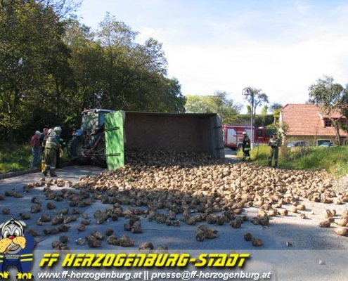 Aus noch ungeklärter Ursache stürzte bei der Talfahrt Richtung Herzogenburg ein mit Zuckerrüben beladener Traktoranhänger vor der Verkehrsinsel um.
