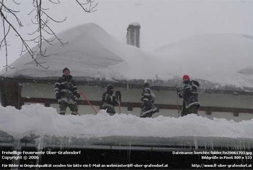 Einsatz, Technisch Tagelange starke Schneefälle im Bezirk Lilienfeld lassen viele Dächer an ihre maximalen Traglasten kommen, seit rund 36 Stunden sind die Feuerwehren dort im Dauereinsatz um Dächer von Schnee freizuschaufeln.